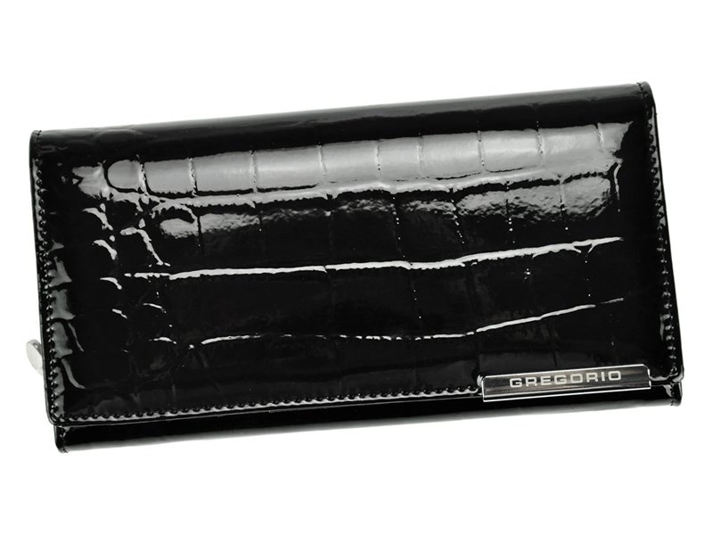Efektowny, zgrabny portfel damski wykonany z wysokiej jakości lakierowanej skóry naturalnej o ciekawej fakturze imitującej skórę krokodyla. Delikatne logo na froncie dodaje całości uroku. Klasyczny, podłużny fason w poziomym układzie, który wiele pomieści. Portfel ten będzie stylowym dodatkiem w każdej kobiecej torebce.