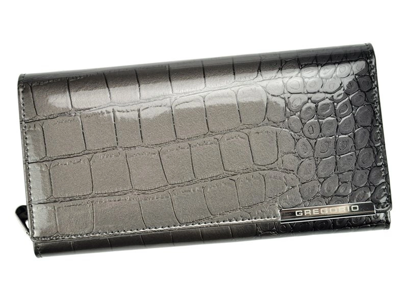 Efektowny, zgrabny portfel damski wykonany z wysokiej jakości lakierowanej skóry naturalnej o ciekawej fakturze imitującej skórę krokodyla. Delikatne logo na froncie dodaje całości uroku. Klasyczny, podłużny fason w poziomym układzie, który wiele pomieści. Portfel ten będzie stylowym dodatkiem w każdej kobiecej torebce.