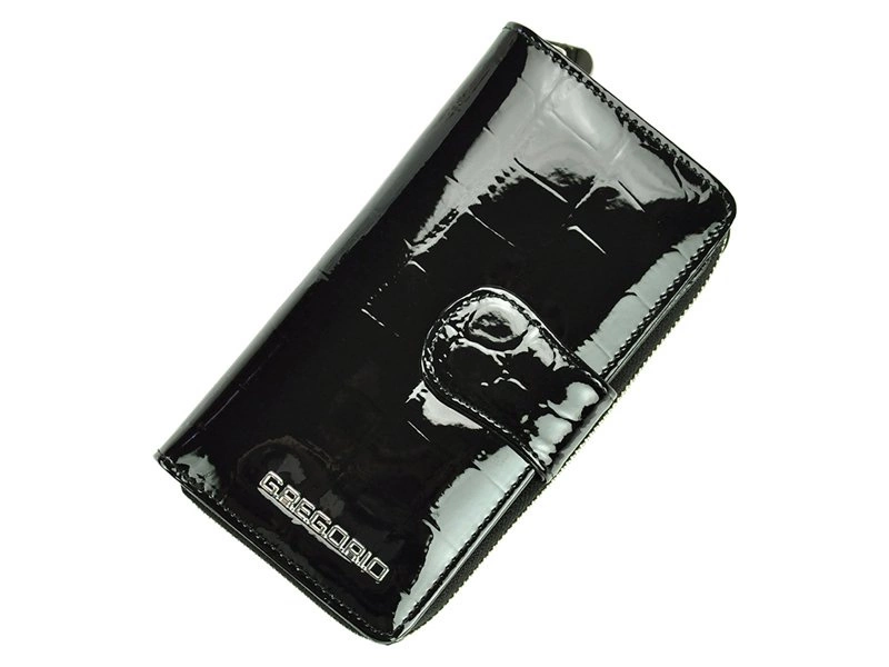 - Podręczny damski portfel z piękną fakturą w typie skóra krokodyla. Na zewnątrz widoczne jest srebrne logo producenta Gregorio, które podkreśla nieskazitelną całość. Bogato wyposażony, a więc dla wszystkich Twoich drobiazgów będzie miejsce.