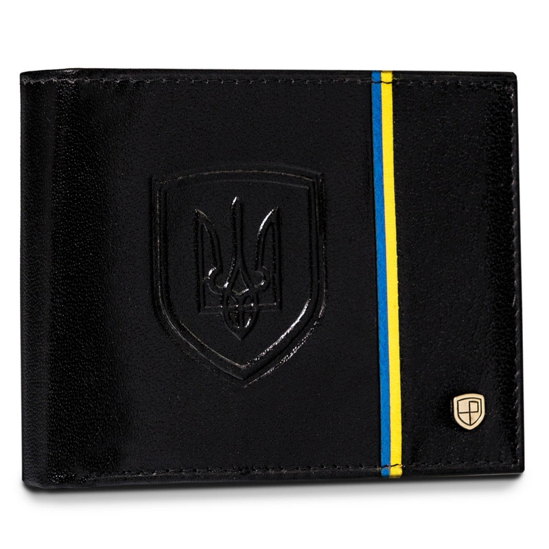 • Odszyty bardzo trwale z doskonałej jakości skóry naturalnej. Model w orientacji poziomej bez zapięcia. Na froncie mieści się delikatny motyw niebiesko-żółtej flagi oraz wizerunek godła Ukrainy. Wyposażony w technologię RFID BLOCKING SYSTEM.