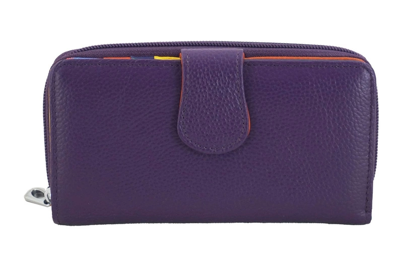 Wnętrze portfela: kolorowe portfele damskie skórzane podzielone są na dwie odrębne strefy. W części zasuwanej wyodrębniono dwie przegrody oraz zasuwaną kieszonkę na monety. Druga cześć zapinana na zatrzask mieści siedemnaście przegródek na karty płatnicze lub lojalnościowe, dwie przegrody na banknoty oraz trzy przegrody / schowki, duże miejsce na zdjęcie najbliższych oraz miejsce na dokument ze zdjęciem np. dowód osobisty. Każdy portfel posiada wewnątrz kombinację różnego zestawu kolorowych przegródek, które wyróżniają ten model.