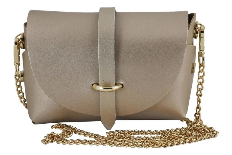Wnętrze torebki: jednokomorowe torebki ze skóry metalizowanej są surowo wykończone. Zapinane są paseczkiem przechodzącym przez złotą ozdobną szlufkę. Długość łańcuszka: 120cm.