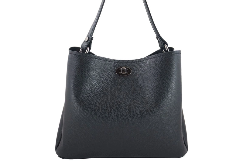 Wnętrze kuferka: komora główna jest surowo wykończona. Wewnątrz znajduje się pojemna zasuwana komora z mniejszą zasuwaną kieszenią mieszczącą telefon, portfel lub kosmetyki. Kuferek skórzany z ozdobnym zapięciem posiada uchwyt bez regulacji (długość 41cm, wysokość 19cm), dodatkowy i regulowany pasek (maksymalna dł. 115cm, maksymalna wys. 62cm) oraz metalowe stopki na spodzie, chroniące przed otarciem.