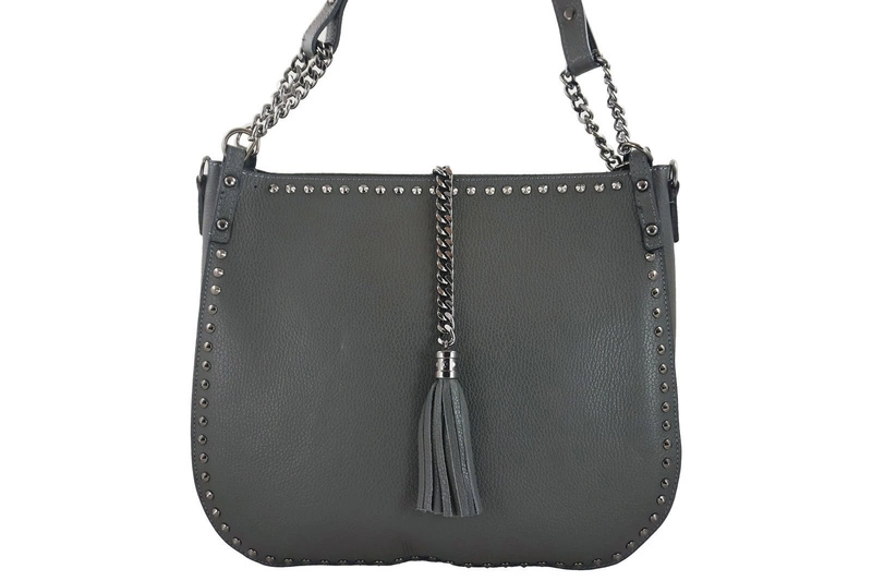 Modna torebka skórzana na ramię z nitami - Szara ciemna