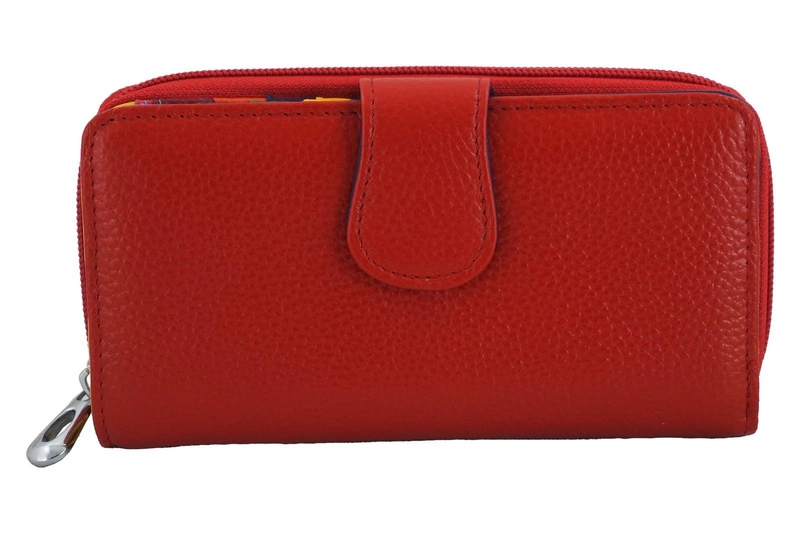 Wnętrze portfela: kolorowe portfele damskie skórzane podzielone są na dwie odrębne strefy. W części zasuwanej wyodrębniono dwie przegrody oraz zasuwaną kieszonkę na monety. Druga cześć zapinana na zatrzask mieści siedemnaście przegródek na karty płatnicze lub lojalnościowe, dwie przegrody na banknoty oraz trzy przegrody / schowki, duże miejsce na zdjęcie najbliższych oraz miejsce na dokument ze zdjęciem np. dowód osobisty. Każdy portfel posiada wewnątrz kombinację różnego zestawu kolorowych przegródek, które wyróżniają ten model.