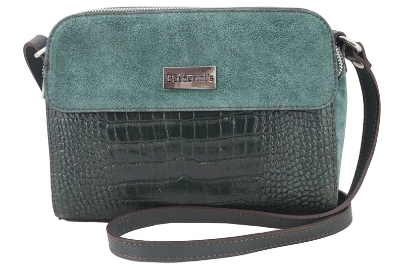 Wnętrze torebki: trzy odrębne komory są zasuwane i wykończone podszewką. W jednej znajduje się mała zasuwana kieszonka, w drugiej kieszeń otwarta mieszcząca telefon, niewielki portfel lub mały notes. Stylowa torebka crossbody trzykomorowa posiada srebrne okucia oraz długi regulowany pasek (maksymalna dł. 136cm, maksymalna wys. 65cm). Klasyczny fason zdobi zamszowa klapka oraz motyw zwierzęcy croco z przodu torebki.