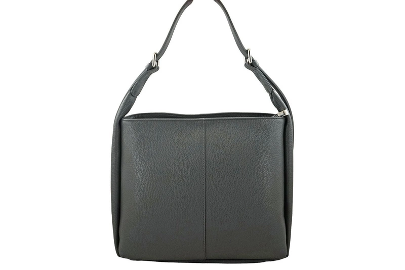 Wnętrze torebki: w komorze głównej, wykończonej podszewką, znajduje się mała zasuwana kieszonka oraz dwie kieszenie otwarte mieszczące telefon, portfel oraz klucze. Dodatkowo wyodrębniono dwie duże boczne wewnętrzne kieszenie zapinane na zatrzask. Klasyczna torebka skórzana na ramię jest zasuwana, posiada srebrne okucia, wygodnej długości uchwyt z czterostopniową regulacją (maksymalna dł. 80cm, maksymalna wys. 42cm), ozdobiony srebrnym klamrami. Torebka posiada pionowe przeszycie z obu stron, wyróżniające ten model. Klasyczna torebka skórzana na ramię dostępna w szerokiej gamie stonowanych kolorów.