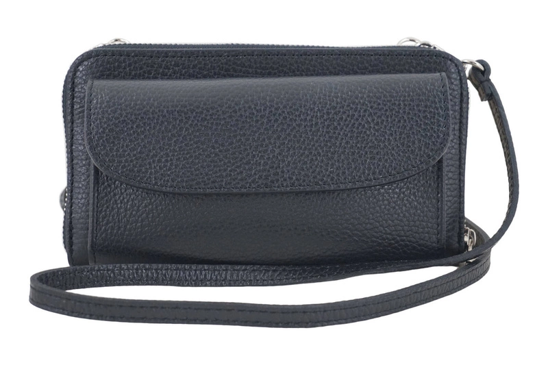 Wnętrze portfela/etui: portfel z etui na telefon ze skóry licowej posiada dwie odrębne strefy. W części na suwak znajduje się zasuwana kieszonka na monety, przegrody na banknoty oraz osiem miejsc na karty płatnicze, lojalnościowe, dowód osobisty i prawo jazdy. Portfel z etui na telefon ze skóry licowej posiada srebrne okucia, dużą kieszeń z przodu zamykaną na zatrzask (wymiary kieszeni: wysokość 9cm, szerokość 17cm, głębokość 1,8cm) oraz doczepiany i regulowany pasek (maksymalna dł. 121cm, maksymalna wys. 63cm). Ofertę kierujemy do kobiet, dla których wygoda jest podstawowym kryterium w wyborze praktycznych rozwiązań do przechowywania dokumentów oraz telefonu, idealnych na zakupy, spacer lub np. jazdę na rowerze. Wygodny i praktyczny portfel z etui na telefon ze skóry licowej nie krepuje ruchów przewieszony przez ramię, jednocześnie będzie gustownym dodatkiem stroju zarówno casualowego jak i sportowego.