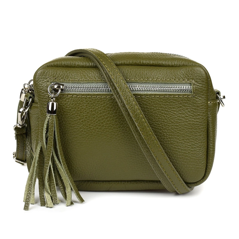 Oliwkowa torebka damska listonoszka skórzana z frędzlem modna C74