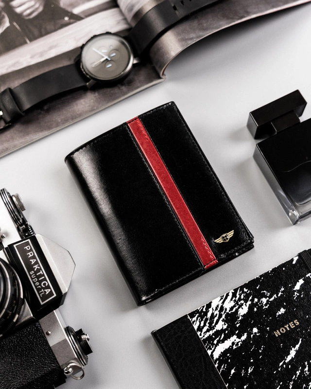 - Elegancki fason, który nigdy nie wyjdzie z mody | Czarny kolor to klasyka, a portfel w tym kolorze daje poczucie komfortu i świadomość, że możesz poczuć się modnie. Front portfela zdobi elegancki czerwony pasek
