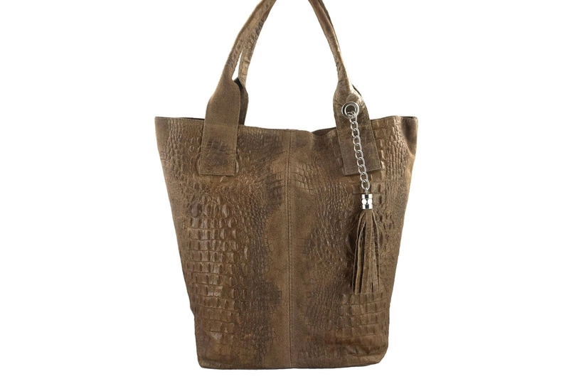 Modny worek skórzany - CROCO został wyprodukowany we Włoszech, wykonany ze skóry naturalnej zamszowej. Propozycja sklepu internetowego - torebka, która uzupełni swobodne stylizacje. Miękka zamszowa skóra naturalna, wygodnej długości uchwyty, modny frędzelek i zwierzęcy motyw - wszystko to gwarantuje, iż Twoja stylizacja będzie wyjątkowa. Modny worek skórzany typu shopper, mieszczący format A4, na wygodnej długości uchwytach idealnie komponuje się ze swobodnymi casualowymi stylizacjami do pracy oraz na uczelnię. Skorzystaj z naszej oferty i odbierz rabat -15% za zapisanie się do newslettera.