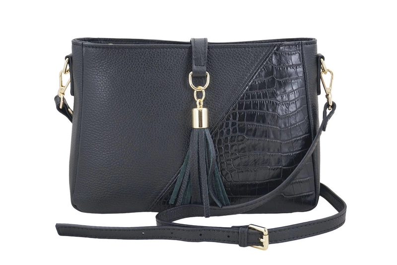 Torebka skórzana z ozdobnym frędzlem - Czarna