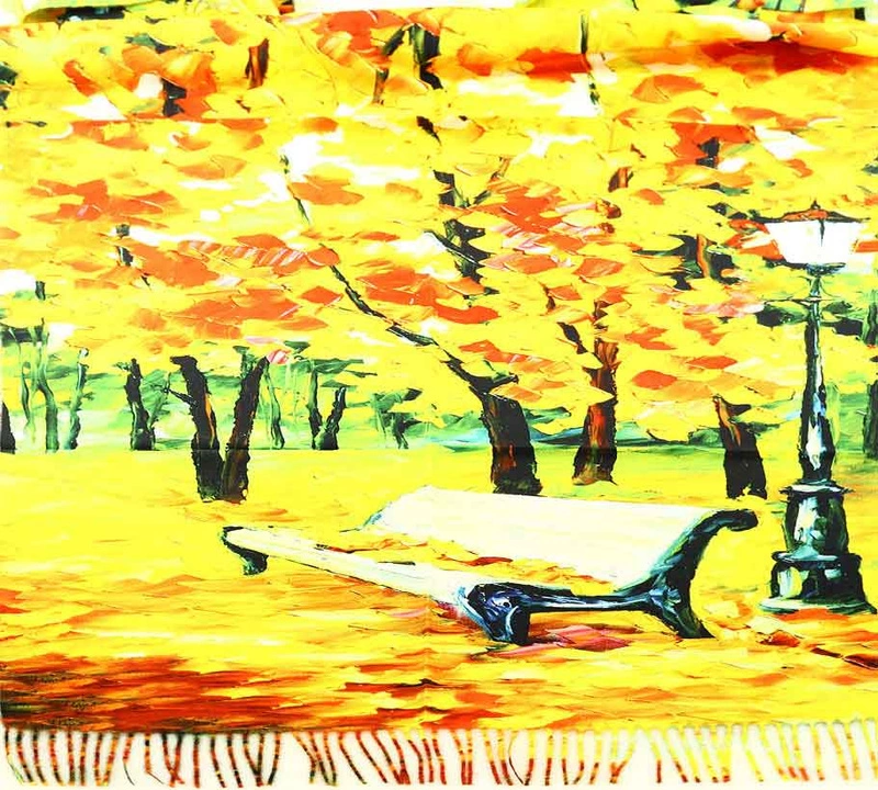 Duży szal damski z przyjemnej w dotyku wiskozy otuli Cię w chłodne jesienno-zimowe dni. Oryginalny i nietuzinkowy wzór inspirowany impresjonistycznymi obrami malowanymi akwarelami nada wyjątkowy charter Twoim stylizacją. Szal damski w słoneczniki będzie doskonałym pomysłem na prezent dla Kobiet o artystycznej duszy. Model wykonany z miękkiej, ultraprzyjemnej w dotyku tkaniny - 100% viskoza. Szal jest dwustronny: z jednej strony znajdują się słoneczniki, z drugiej strony obraz przedstawia jesień w parku. Dominujące kolory to żółty, zielony i pomarańczowy . Duży rozmiar 67 x 185 cm daje wiele możliwości noszenia, w formie szala, chusty na ramiona, czy w formie szala na głowę. Możliwości jest wiele, a efekt za każdym razem na pewno Cię zachwyci.