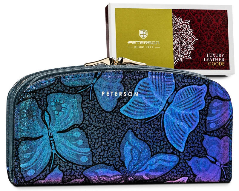 Skórzany portfel damski zdobiony holograficznymi motylami — Peterson