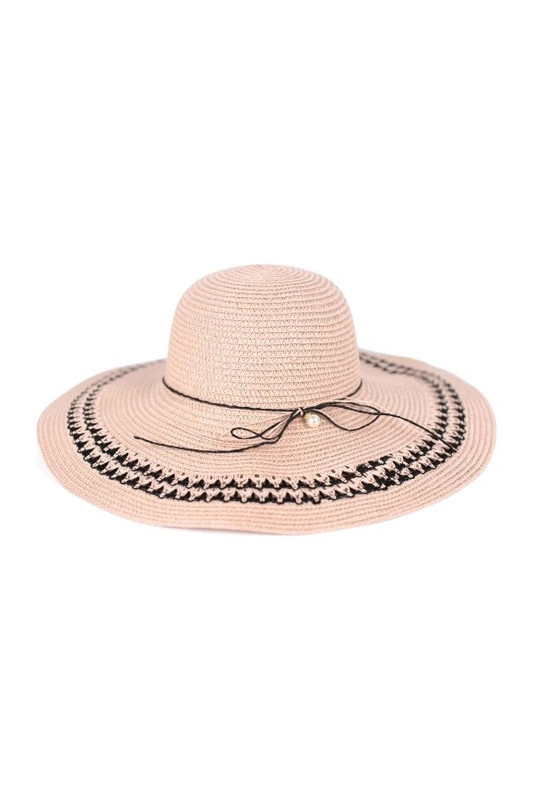 Romantyczny kapelusz na lato z kokardą i delikatnym kontrastowym zdobieniem.
