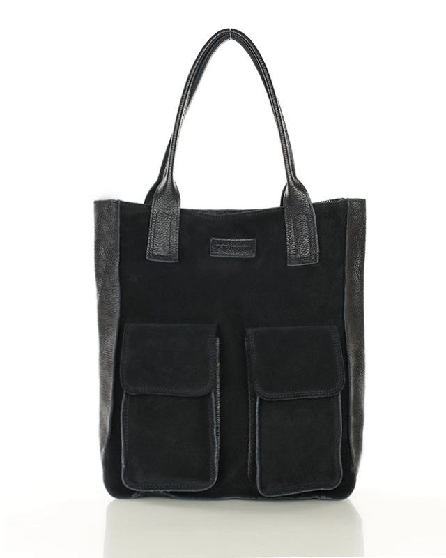Torebka zamszowa shopper bag z kieszeniami skóra naturalna - MARCO MAZZINI czarny