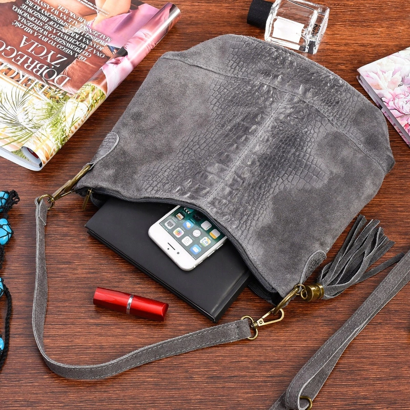 Torebka skórzana zamszowa CROCO listonoszka 2 paski szara Beltimore W13