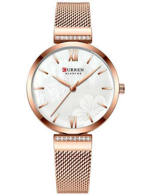 Zegarek męski CURREN 9067 to elegancki damski zegarek idealny zarówno do eleganckiego ubioru, jak i do noszenia na co dzień. Na perłowej tarczy z indeksem w kolorze różowego złota znajdziemy klasyczne, czytelne srebrne wskazówki.
