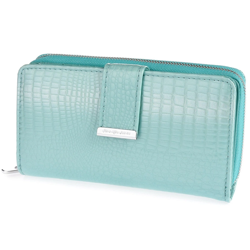 Turkusowy skórzany portfel damski lakierowany duży poziomy w piórka elegancki Jennifer Jones E72