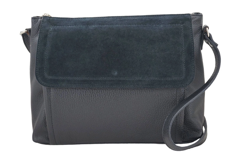 Torebka skórzana z zamszową klapką w kolorze czarnym jest wykonana ze skóry naturalnej licowej, w połączeniu ze skórą naturalną zamszową. Idealna propozycja wśród torebek na każdy dzień - duża ilość kieszeni powoduje, iż wszystkie niezbędne rzeczy do pracy będą na swoim miejscu, a szeroki i regulowany pasek umożliwia dostosowanie długości do noszenia torebki na ramieniu lub wygodnie przewieszonej przez ramię. Oferowane w najnowszej kolekcji torebki zaprojektowano tak, aby mieściły dokumenty, notatki, organizer lub notebook. Torebka skórzana z zamszową klapką to propozycja dla Pań ceniących gustowne dodatki codziennej garderoby, zwracających uwagę na jakość i estetykę wykonania produktu ze skóry naturalnej. Zachęcamy do zapoznania się ze szczegółową ofertą klasycznych torebek damskich skórzanych. Oferujemy również duży wybór portfeli ze skóry lakierowanej lub z kolorowym wnętrzem, zapakowanych w ozdobne, dopasowane pudełko.