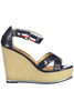 - sandał, pasek na kostkę, klin 12 cm, kontrastowe detale, logo