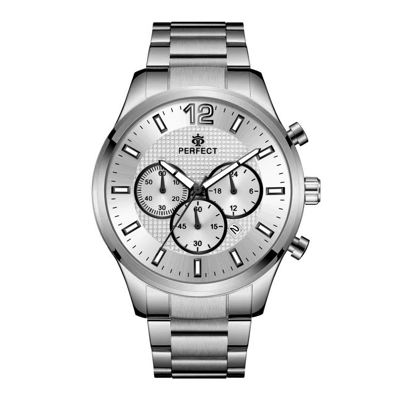 Tarcza zegarka wyposażona w trzy wskazówki: godzinową, minutową i sekundową. Dodatkowo mały datownik i trzy małe zegary. Solidne wykonanie i precyzyjne mechanizmy – to właśnie zegarki marki Perfect.
