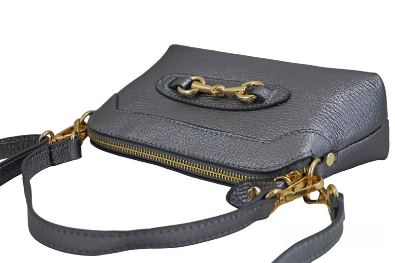 Mała torebka wieczorowa skórzana w kolorze srebrnym ciemnym została wykonana ze skóry naturalnej licowej. Klasyczny fason urozmaicony złotymi ozdobami mocowanymi na doszytym elemencie skórzanym, z przodu torebki oraz modna metalizowana skóra naturalna wyróżnia ten model listonoszki, która podkreśli stylizacje na wyjątkowe okazje. Dostępna w najnowszej kolekcji, w kolorze ciemnego srebra oraz złota, mała torebka wieczorowa skórzana będzie idealna dla osób, którym zależy na niewielkich gabarytowo, aczkolwiek pojemnych i jednocześnie stylowych torebkach ze skóry naturalnej. Dzięki klasycznemu i stonowanemu wzornictwu, niewielka błyszcząca torebka wyróżni Twój outfit na każdej uroczystości lub spotkaniu ze znajomymi. Zapoznaj się z najnowszą ofertą torebek skórzanych dostępnych w naszym sklepie - listonoszek, klasycznych lub wygodnych plecaków oraz portfeli. Oferujemy duży wybór produktów galanterii skórzanej Dla Niej i Dla Niego.