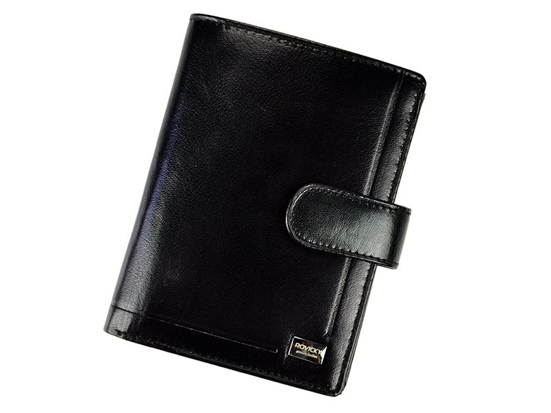 - Portfel męski ze skóry naturalnej w dużym rozmiarze. Zamykany patką z mocnym zatrzaskiem. Na froncie eleganckie przeszycia oraz logo marki Rovicky na metalowej blaszce. Portfel zabezpieczony antyskimmingową membraną RFID Stop.