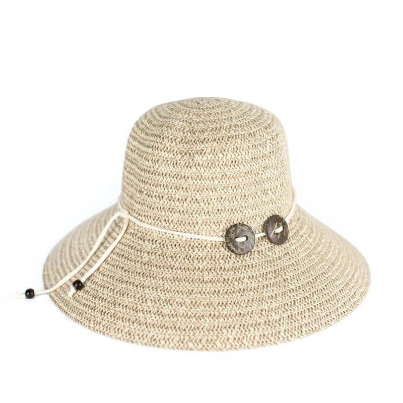 Elegancki kapelusz z dużym rondem ozdobnymi guzikami.