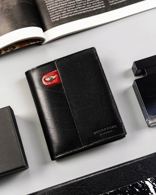 • Modny design | Odszyty bardzo trwale z doskonałej jakości gładkiej skóry naturalnej w czarnym kolorze, dodatkowo na froncie portfela wyszyto trójkolorowy paseczek;