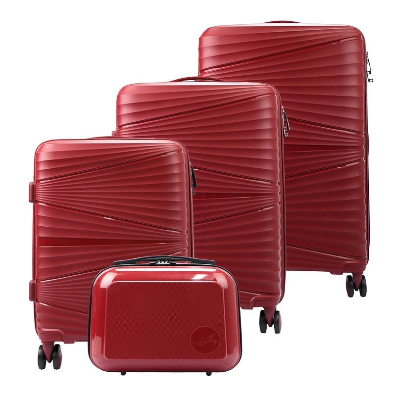 W skład zestawu wchodzą trzy walizki – mała, średnia i duża – oraz praktyczna kosmetyczka podróżna, która doskonale sprawdzi się na drobiazgi i akcesoria. Dzięki różnym rozmiarom walizki można dopasować do rodzaju wyjazdu, a cały komplet tworzy spójną i funkcjonalną całość.