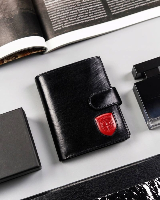 • Duży portfel o klasycznej stylistyce. Model w orientacji pionowej zamykany na zatrzask;