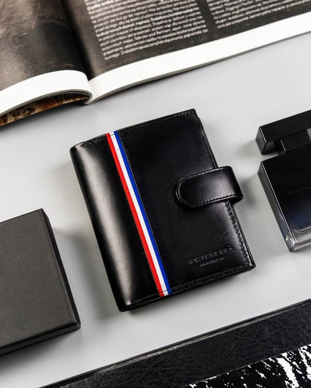 • Ergonomiczny design | Odszyty bardzo trwale z doskonałej jakości gładkiej skóry naturalnej w czarnym kolorze, dodatkowo na froncie portfela wyszyto trójkolorowy paseczek;