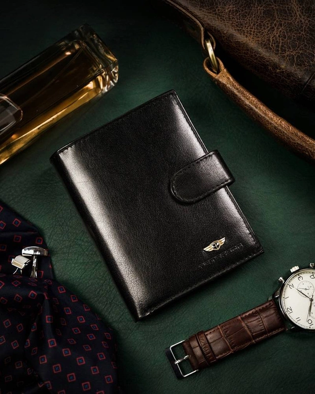 - Ponadczasowy fason dla Panów w każdym wieku | Portfel o klasycznej stylistyce. Model w orientacji pionowej z zapięciem zewnętrznym;
