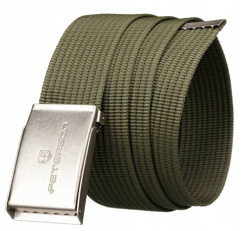 - Codzienny parciany pasek z wysokogatunkowych materiałów. Wyposażony w srebrną, zaciskową klamrę ozdobioną logo marki Peterson. Końcówka paska zabezpieczona metalowym okuciem.