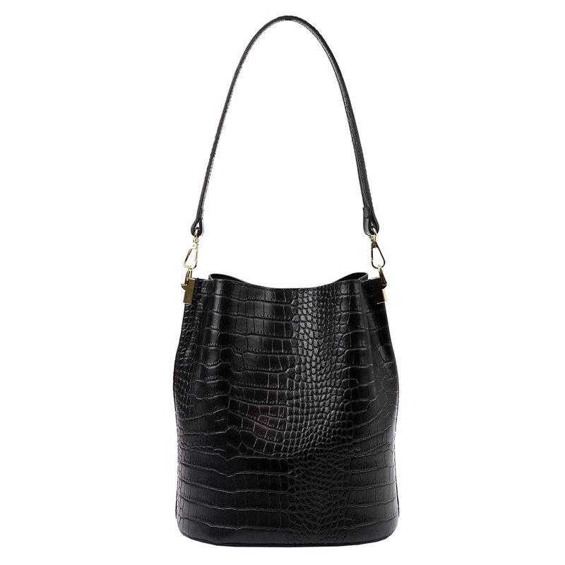 Torebka została wykonana z naturalnej skóry o eleganckim wzorze imitującym skórę krokodyla, co nadaje jej luksusowego wyglądu.