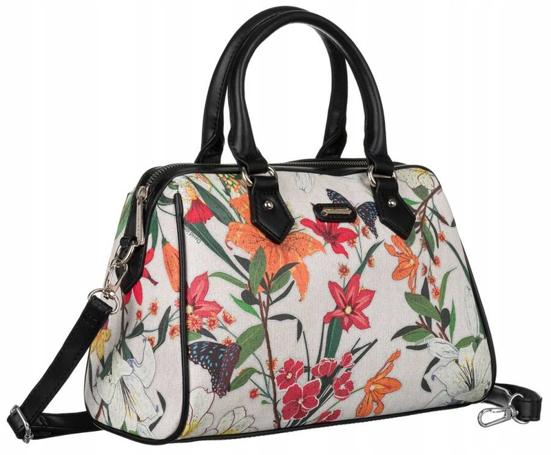 - Torba odszyta z wysokogatunkowej skóry ekologicznej. Ozdobiona żywym, kolorowym wzorem kwiatów. Środek wyściełano praktyczną podszewką. Torebka oprócz zapinanego przy pomocy karabińczyków paska ma też wysokie uchwyty u jej szczytu.