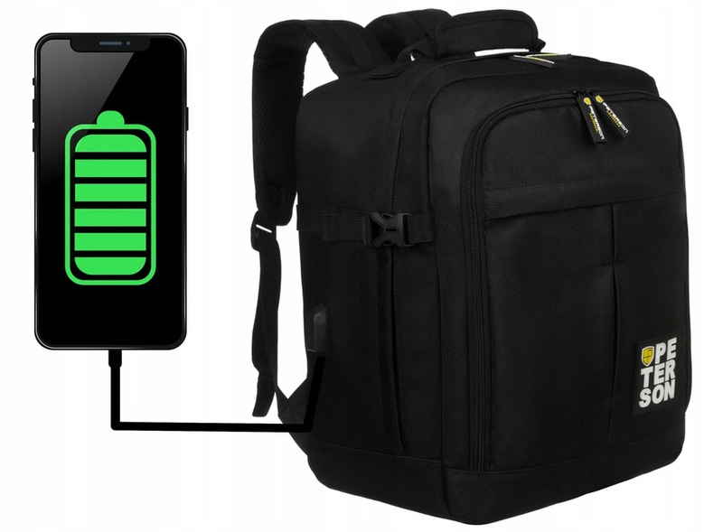 Plecak w swym wyposażeniu posiada również kabel i port USB, który służy jako "przejściówka". Umożliwia to w wygodny sposób ładowanie Twojego laptopa, tabletu czy smartfona, bez wyjmowania go z plecaka.