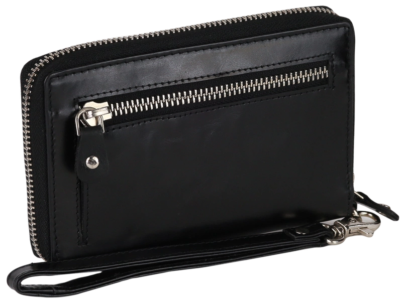 - Etui-portfel na karty i dokumenty z praktyczną kieszenią na telefon. Wykonane z gładkiej skóry naturalnej najwyższej jakości. Etui wyposażone w zewnętrzną kieszonkę na suwak. W zestawie odpinana smyczka na nadgarstek.