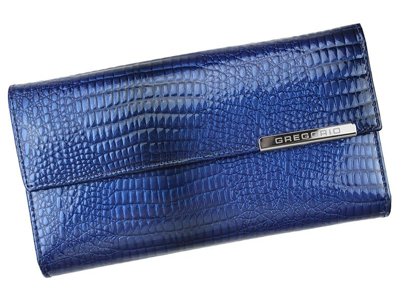 • Portmonetka, klasyczny podłużny portfel od marki Gregorio. Świetne wykonanie z efektem skóry węża. Model zamykany jest klapą na zatrzask. Wewnątrz dużo miejsca do przechowywania. Elegancki fason, ze srebrnymi zdobieniami i lakierowaną fakturą.