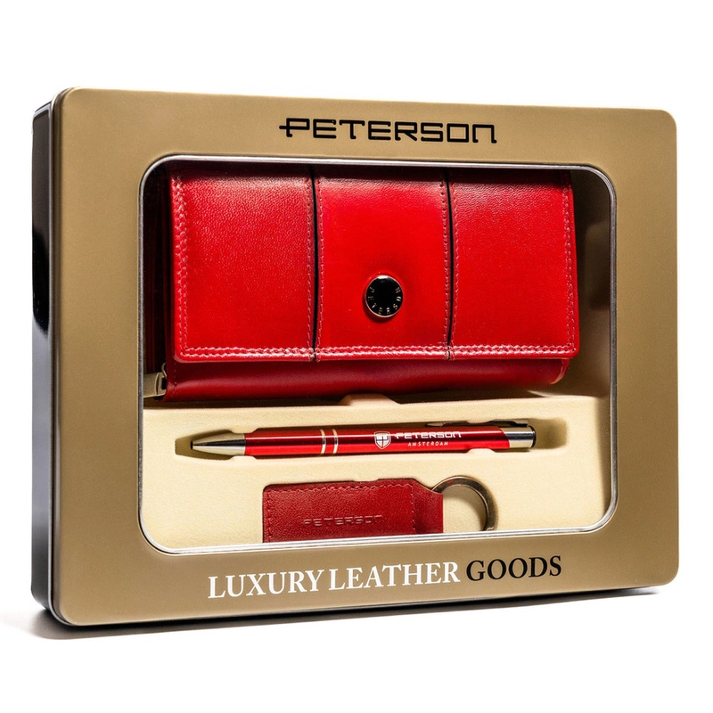 Zestaw prezentowy: skórzany portfel damski na zatrzask, brelok i czerwony długopis - Peterson