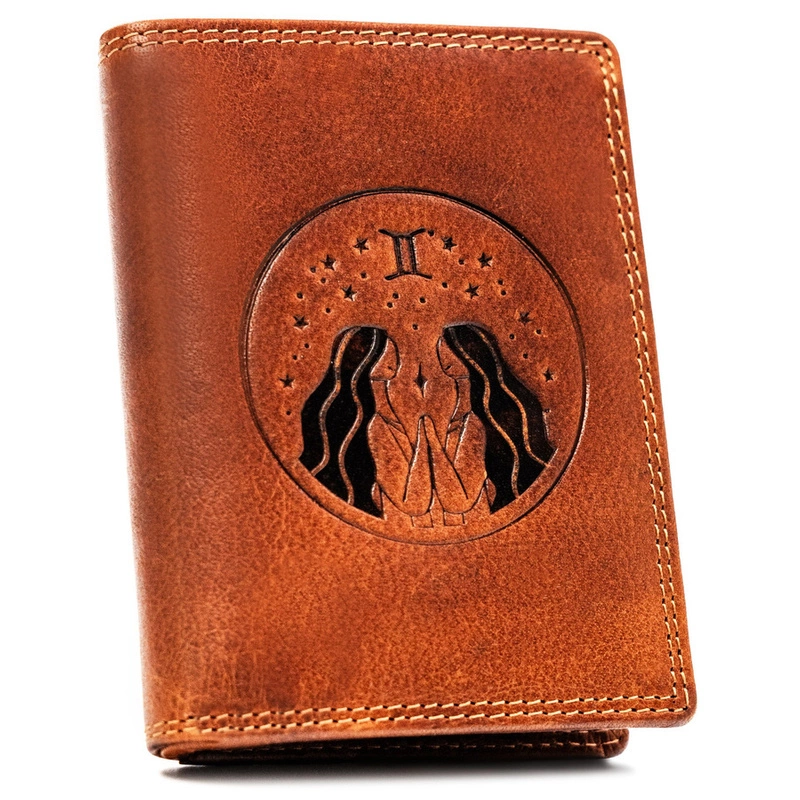 Portfel odszyty z trwałej skóry naturalnej o klasycznej stylistyce. Model w orientacji pionowej bez zapięcia zewnętrznego. Jako symbol Twojej osobowości na froncie portfela został wytłoczony Twój znak zodiaku.