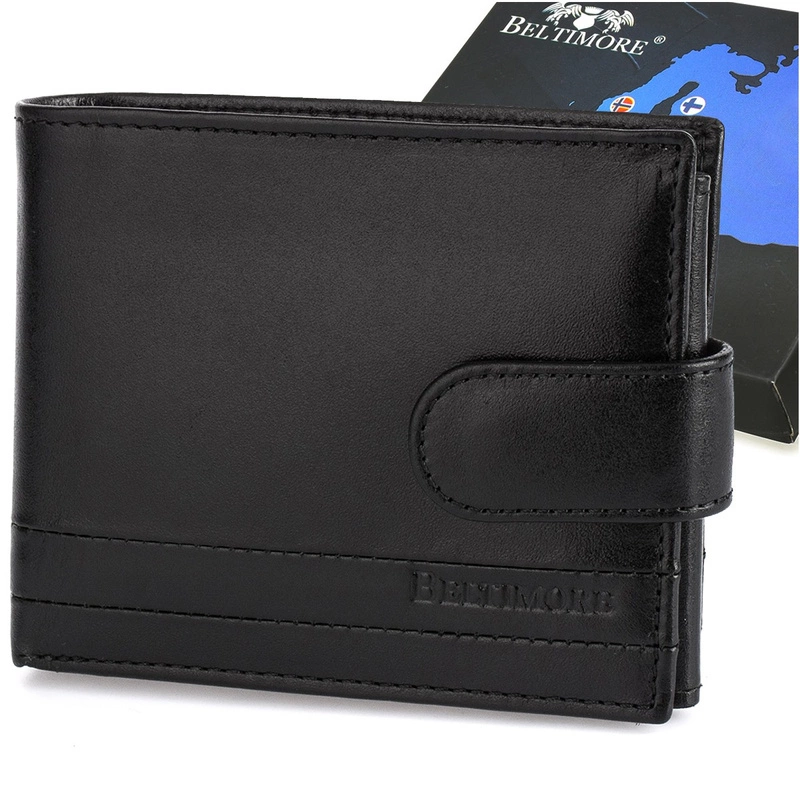 Marka Beltimore, model portfela: G08 - w czarnym, klasycznym kolorze, poziomy, z zewnętrzną zapinką.