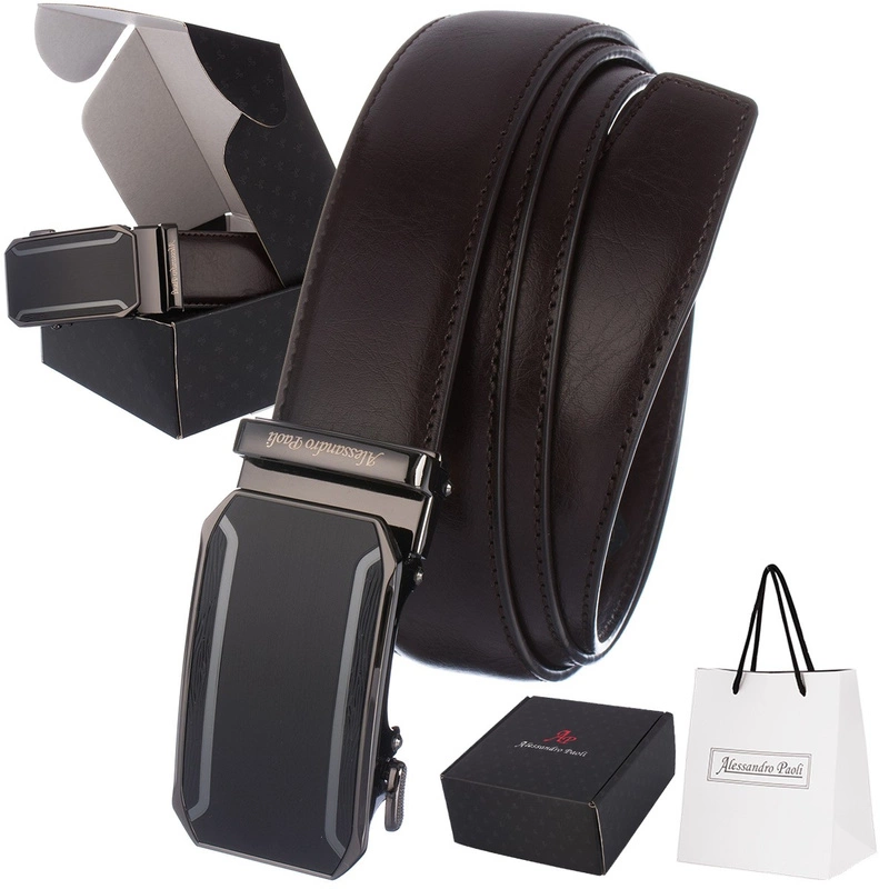 Męski pasek skórzany klamra automat 3,5 cm klasyczny pudełko torebka gratis brązowy AP6 : Kolory - brązowy, beżowy, Rozmiar pasków - r.110-125 cm