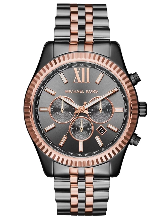 Model Michael Kors MK6473 z serii Lexington to elegancki męski zegarek na bransolecie w kolorze szarym z dodatkiem różowego złota wykonanej ze stali szlachetnej. Oznaczenia godzinowe w postaci cyfr rzymskich oraz indeksów świetnie komponują się z tarczą i wskazówkami. Wyposażony jest w precyzyjny mechanizm kwarcowy, dzięki któremu zegarek dokładanie pokazuje aktualną godzinę. Dostępne funkcje to chronograf, datownik dnia miesiąca oraz 24-godzinne wskazanie czasu. Tarczę ochrania mineralne, odporne na zarysowania szkiełko.