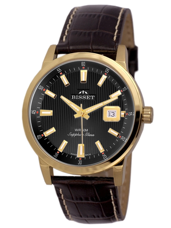Model BISSET BSCE62 dla mężczyzn lubiących elegancję. Czasomierz ten został wyposażony w szwajcarski mechanizm kwarcowy. Koperta stalowa w kolorze złotym, połączona jest ze skórzanym brązowym paskiem. W modelu tym zastosowano trwałe szkło szafirowe. Wodoszczelność 50M, odporny na przypadkowe zachlapania.