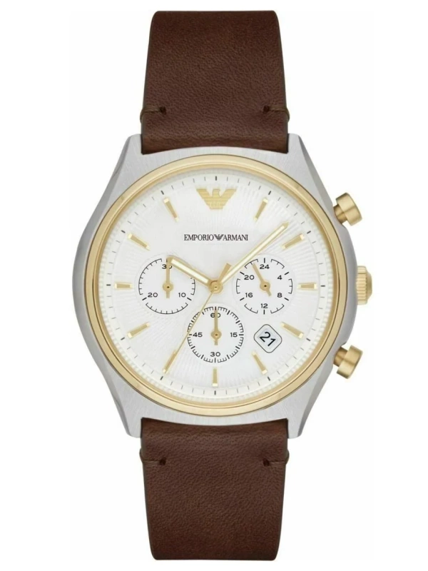 Zegarek Emporio Armani AR11033 to męski czasomierz, idealny zarówno do eleganckiego ubioru, jak i do noszenia na co dzień. Kopertę wykonano ze stali szlachetnej, co gwarantuje jej wieloletnią odporność na zniszczenie. Na tarczy w kolorze beżowym zabezpieczonej szkłem mineralnym znajdziemy datownik dnia miesiąca oraz wskazania chronografu i czasu dobowego. Całości dopełnia wysokiej jakości skórzany pasek w kolorze brązowym.