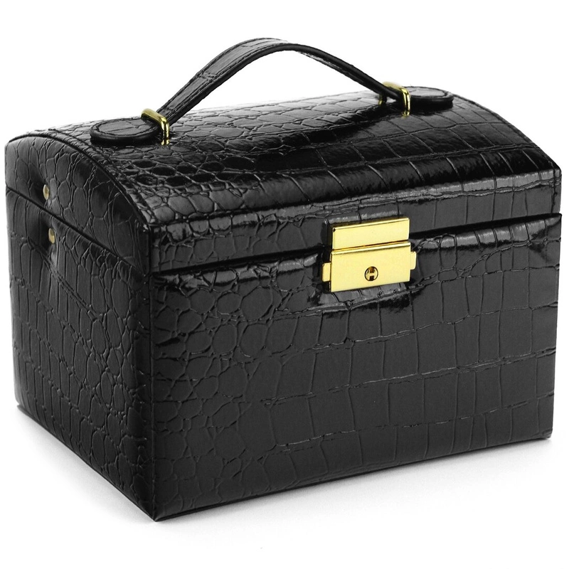 Patrizia prezentuje elegancki kuferek na biżuterię, zaprojektowany z dbałością o detale. Wykonany z ekologicznej skóry o fakturze skóry krokodyla, przyciąga wzrok luksusowym wyglądem i starannością wykończenia.