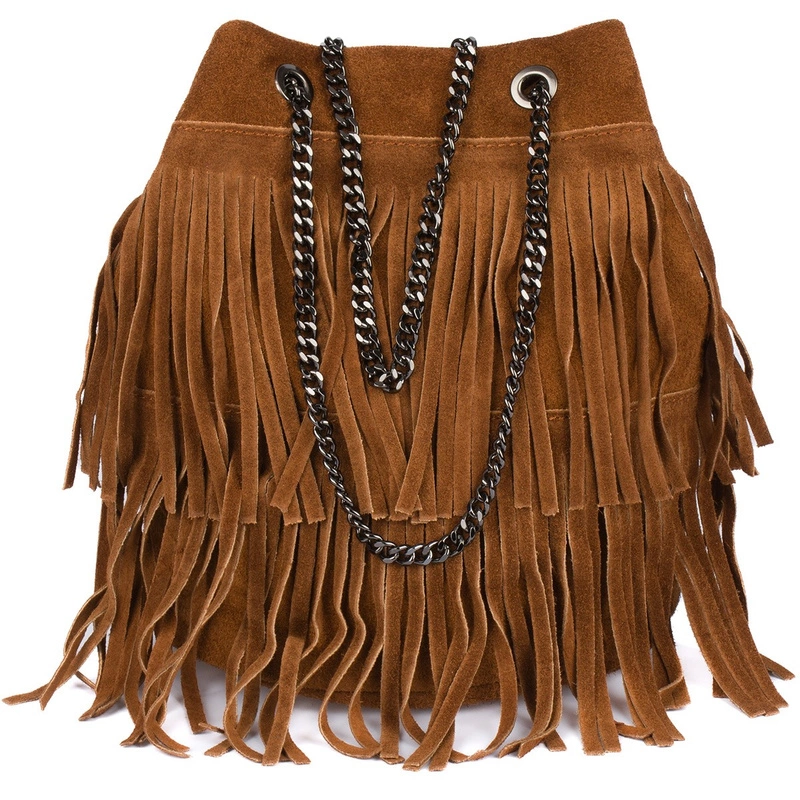 Damska Torebka Worek Skóra Zamsz Frędzle troczki łańcuch Włoska koniak M24