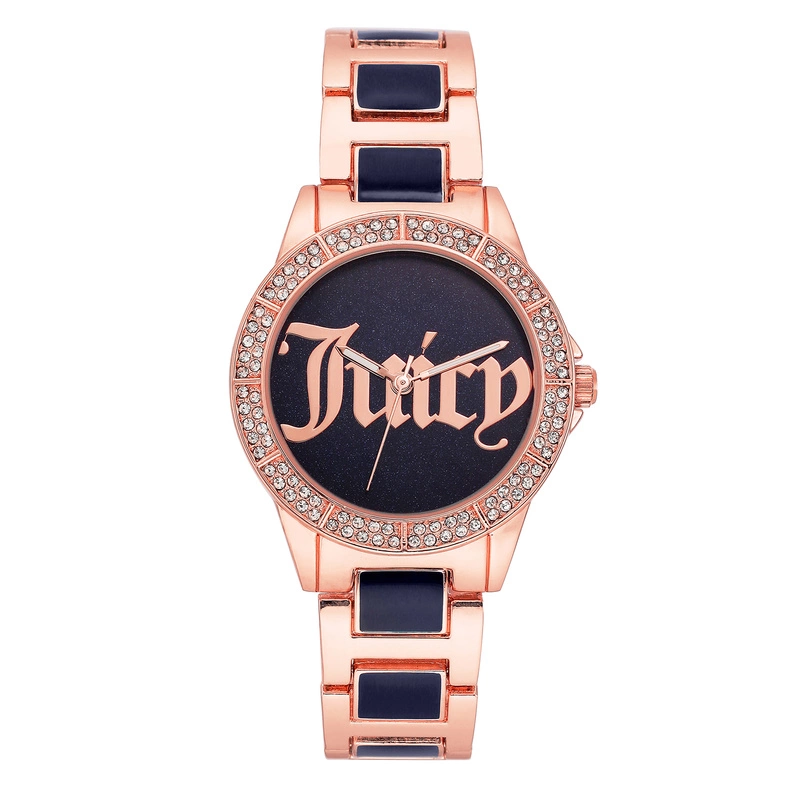 Zegarek JUICY COUTURE Damski JC1308NVRG (36 MM). Typ mechanizmu: Kwarcowy. Wyświetlacz: Analogowy. Materiał koperty: Metalowe. Kolor koperty: Różowy. Materiał bransoletki: Metalowe. Kolor bransoletki: Różowy. Kolor wskazówek: Niebieski. Typ szkiełka: Mineralne. Rodzaj zapięcia: FOLDING. Średnica tarczy: 36 MM. Wodoszczelność: Nie